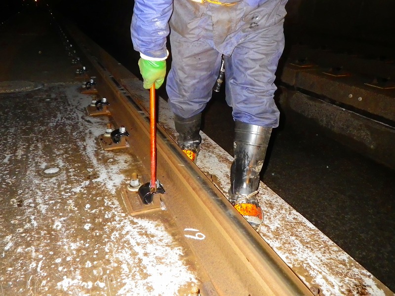 新幹線の軌道は線路の歪みが発生しにくく、高速運転に耐える強い構造ですが、経年や高速で列車が繰り返し通過することにより、少しずつ歪みが発生します。レールのわずかな凹凸を整正するため、レール底部に樹脂を注入したり、調整板を挿入し調整します。0.5ミリ単位で線路を仕上げる技術こそが新幹線の高速走行を可能にしているのです。それが、お客様の快適な乗り心地や高速走行を支えています。
